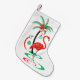 En roligt-, fetiv-, flamingodesign med en återtryck i rött och grönt. En röd flamingovågor i vatten intill handflatan träd, dekorerad med julbalkar och band. Ett anpassade som du kan anpassa med egen text, bilder och egna idéer. En originalbild för digital konst skapat av Jess Perry.
