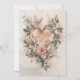 Kortet "Blush Floral Heart with Butterflies and Soft Botanicals" öppnar med ett mjukt skiktat hjärta format av akvarellrosor, trädgårdsblommor och luftig botanisk lövverk, arrangerade i en balanserad vertikal komposition. Detta gratulationskort har en målerisk rosenskär och elfenbensfärgad palett med varma persikofärgade undertoner, dämpade salvia-gröna nyanser och mjuka sepia-skuggor, satta mot en mjukt texturerad bakgrund som frammanar tidlös brevpappersstil. Ömtåliga fjärilar svävar bland blommorna, deras genomskinliga vingar ger lätthet och mjuk rörelse, medan subtila vintage-texturer ger en känsla av att vara en värdefull familjegärd.