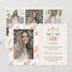 Vackra och charmiga examensannonser och inbjudningar till juristexamen med en guldskala rättvisedesign med en akvarelllookande rosa och persikoros och piondesign i vackra blekgröna, krämfärgade och pergamentliknande toner och mönster. Lägg till fyra av dina favoritbilder av den nyutexaminerade på dessa shabby chic-examensannonser och inbjudningar till sjuksköterskeexamen. Designad och skapad av Chrissy H. Studios, LLC. Med ensamrätt.