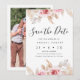 Rustikt rodnad blomsterbröllop spara datum kort med en vacker akvarell blomsterarrangemang med pampasgräs. Detta bröllop spara datum-kort har också parets foto på baksidan av kortet, inom en vit ram. Denna design är idealisk för ett par som söker en romantisk gammaldags spara datum med en modern twist.