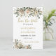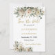 Meddela din speciella dag med stil med detta eleganta ”Spara datum”-kort, prytt med mjuka blommor i rosaton, ömtålig grönska och graciöst skript i rosaton och guld. Den romantiska designen sätter tonen för er kommande bröllopsdag och gör ett varaktigt första intryck på era gäster.