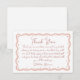 Fira din speciella dag med en hjärtlig touch med detta charmiga bröllopsfest-kort. Designat med en delikat, handmålad och fantasifull ram i mjuka rosa och bruna nyanser och elegant, tryckt bokstavsstil, ger det en mjuk och romantisk känsla till din fest. De konstnärliga, handritade detaljerna skapar ett varmt och personligt intryck, perfekt för en vår- eller sommarträdgårdsfest med en subtil bohemsk anda. Anpassa enkelt ditt meddelande online med enkla Zazzle-verktyg, inga nedladdningar eller designkunskaper krävs. Ett vackert sätt att uttrycka tacksamhet och ge dina gäster en bestående, genomtagen minnesbild av din glädjefulla tillställning.