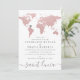 Vacker dämpad rosablommig världskartainbjudan för destinationbröllop med en hjärtformad platsmarkör som du kan flytta för att markera din brölloppsplats och skapa en elegant rosa och grå rese-tema inbjudan för en lokal hemma-reception eller destinationbröllop.