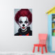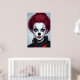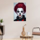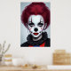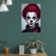 En porträtt av en dam med vit ansikte, svart näsa och rött läppar och hår i lustigt klädda kläder. Det här är en AI-skapad konst.