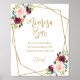 Denna eleganta bröllopsfestsvit har en burgunderröd och rosafärgad bukett i en modern geometrisk guldram. Sviten innehåller kuvertkort, skyltar och personliga festtillbehör som servetter. Om du behöver hjälp med anpassning, inklusive ändringar av färg eller formulering, eller om du upptäcker att något fattas, tveka inte att kontakta oss. OBS: För hjälp med beställningar, leverans, produktinformation osv., kontakta Zazzles kundtjänst direkt
