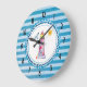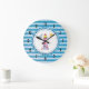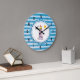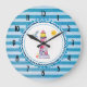 En klocka med nautiskt tema. Designad med en blå strimlad mönster och en blå kantad cirkel överst. En röd strimlad fyr och en strand boll och en leende sol och flygande fiskmås i den avstånd delen av ram.