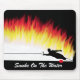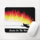 Mousepad med avbildar av slalomvattenskieren som sparkar upp en vägg av, flammar i stället för vatten. Inkluderar text "röker på vatten",