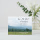 Detta eleganta Spara datum vykort har en vacker landskapsbild av Cades Cove med Smoky Mountains National Park i bakgrunden på en klar sommardag. Detta kort är idealiskt för ett bröllop som kommer att äga rum i områdena runt Smoky Mountains, Gatlinburg och Pigeon Forge. Det är också perfekt för ett sommarbröllop.