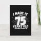 Denna roliga 75-årsdag design gör en bra sarkastisk humor skämt eller nyhetspresent för en 75-årig födelsedagstema eller överraskning 75-årsfirande! Innehåller "Jag klarade mig till 75 år...Inget skrämmer mig" rolig 75-års meme som kommer att ge massor av skratt från familj, vänner, festsällskap och födelsedagsbarnet också!