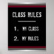 Humoristisk silver-, röd- och svart affisch med utseende av svart tavla med "Klassrumsregler". Ser bra ut i en svart ram!