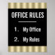 Humoristisk svart och guld "kontorsregler" affisch. Du kan anpassa denna roliga affisch genom att ändra bakgrundsfärgen och lägga till din text för att få den att säga vad du vill. Ser bra ut med en svart ram!