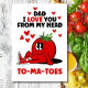 Det här roliga pappa skämt pun kortet säger, jag älskar dig från huvud till-tomater, och har en söt tomat som bär ett par röda höghöjdsskor för löpning. Kittla pappas roliga ben med detta lyckliga fadersdagskort. Och ett annat punny meddelande inuti säger, "Det ser ut som att puns springer i familjen". Klicka på anpassa den här mallen knappen om du vill ändra eller lägga till meddelandet inuti.