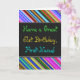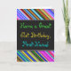 Denna roliga, färgglada och fantasifulla födelsedagstema grusskort design har en varm födelsedagsönskan som "Ha en fantastisk 61-årsdag, Förnamn!" på framsidan. Namnet på framsidan kan anpassas. Övre och nedre delen av framsidan har livfulla, flerfärgade ränder. Insidan har ett födelsedagsmeddelande som kan anpassas. Ett gratulationskort som detta kan vara ett roligt sätt att leverera födelsedags gratulationer till någon som firar sin sextioförsta födelsedag.