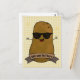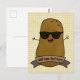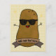 Rolig glad tecknad brun potatis med en stor glad smil och stickarmar som bär coola mörka solglasögon. Bakgrunden är ett gult gingham-mönster. Mot botten av bilden finns ett brunt banderoll med en textmall, denna text kan ersättas för att lägga till ditt eget meddelande.