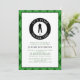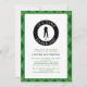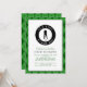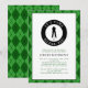 Manlig golf födelsedagsinbjudan anpassad design har en manlig golfspelare silhuett i klassisk svart på en vit form med humoristisk böjd text "Det är dags att börja!" i krispig vit typsnitt på en svart cirkel. Anpassa mallen med namn och detaljer i klassisk svart och grön bokstavsstil. Inbjudan är kantad med en tvåtonad grön argyle-inspirerad ruta som också upprepas på baksidan av inbjudan.