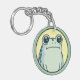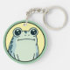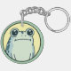 Söt rund nyckelring av en rolig grön tecknad groda med stora ögon och en uttryckslös min i ansiktet på en gul och grön bakgrund.