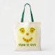 En shoppingväska med gula vildblommefotografier anpassade för att skapa en söt ansikts- och leendedesign. Designen är på en genomskinlig bakgrund så att du kan ändra bakgrunds- och kantfärger och ändra eller ta bort texten. Klicka på "Anpassa"-knappen för att lägga till, ändra eller ta bort texten, ändra bakgrundsfärg och ändra text, stil, storlek eller färg.
