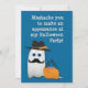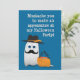 Personalisera och anpassa inbjudan färg! Cool och söt Halloween inbjudan spöke med mustasch på omslaget så man inte kan känna igen honom. Han har svart hatt med orange fjäder och han bär en pumpaväska full av godis från trick or treat.
