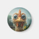 En mycket detaljerad, humoristisk närbild av en kyckling med överdrivet stora blå ögon, ludna fjädrar och ett dumt uttryck, mot en mjukfokus utomhusbakgrund med solrosor.