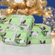 En bra vattenfärgbild av en svart och vit Boston Terrier sitter med roligten 'woof' ord art-bakgrund i en mjuk grönt med blek. Hund bär en vågad grönt vinterscarf och rödsolglasögon.