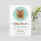 Den könsneutrala babyduschinbjudan har en rolig brun hund med rosa tunga på turkobakgrunden.