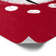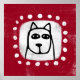 En söt, svart och vit hund över en röd texturerad bakgrund omgiven av vita prickar.