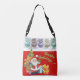 Här är en rolig toto hänger lös för din helgdag som shoppar eller reser. En sida är röd med en fodra av slappt färgadprydnadar över det bästa, Santa med en julgran och gåvor i det lägre vänstert och "skriftlig glad helg" i ljust - grönt. Andra sidan är en snöig plats för natt med en koppla ihop av kabiner och dekorerat och tänt upp det vintergröna träd. Över det bästa är några stränger av pärlor och en båge av röda prydnadar.