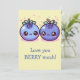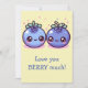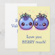 Det här är ett sött Valentine-kort som passar perfekt för klassrummet på Alla hjärtans dag. Två blåbär som säger "älskar dig BÄR mycket!" Det är en söt design med två tecknade bär på en mjuk gul bakgrund som ger värme till designen.