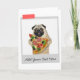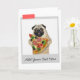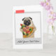 Rolig kort med pug-hund som äter pizza