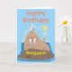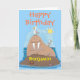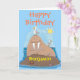 Vår lyckliga valross sitter, själv sunning på en sten i hav. Raddor som är roliga för en valrossdag i tecknad, utformar!