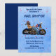 Denna roliga inbjudan till motorcyklistens pensionsfest är designad med en karikerad motorcyklist som kör en gammal cykel. Ett roligt sätt att fira pensioneringen av en familjemedlem, vän eller kollega. Framsidans text innehåller: Fullständigt namn, evenemangsdato och tid, plats och RSVP-information på en färgrik blå bakgrund med mörkblå tryck och accenter och en matchande mörkblå baksida. För att anpassa, infoga bara dina detaljer i vår enkla mall och ersätt exemptexten. Denna inbjudan finns tillgänglig både i tryck och nedladdning. Motorcykel, motorcyklist, rolig, gå i pension, pension, fest.