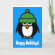Rolig pingvinskämteckning julhälsningskort. Söt pingvinillustration med grön vinterhatt. Icke-konfessionell God Jul hälsning.