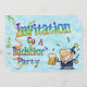 Skrynkligt ljusblått papper som bakgrund med wordart i regnbågens färger dekorerat med pappersslingor i orange och grönt som inbjuder gänget till en sängvätning. Till allt detta finns en komisk seriefigur som bär en festhatt och håller en stege full av öl, med fler slingor som flyger runt honom. En rolig design för en glad tillställning.