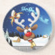 En rolig seriefigur av en ren med en starkt röd näsa och stora vita horn, prydd med en röd och gul båge, tittar genom ett öppet fönster. Utanför syns ett snöigt landskap med silhuetter av tallar och ett litet, upplyst hus under en mörkblå, stjärnfylld natthimmel. Jultomtens släde som dras av renar flyger i fjärran. Scenen frammanar en festlig och fantasifull julstämning. Original Vector Art Copyright BluedarkArt TheChameleonArt.