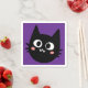 Rolig lila servett med en komisk svart katt tecknad som en seriefigur med stora runda ögon och rosafärgade kinder i en doodle-teckning stil.