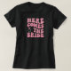 Söt och rolig T-shirt för bruden att vara. Enkel text som säger Här kommer bruden med rosa textning och en rosa ring.