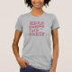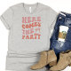 Snygg och rolig grå t-shirt för brudens vänner. Enkel text som säger Här kommer festen med rosa textning och en rosa ring.
