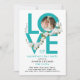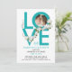 Denna moderna inbjudan till en Alla hjärtans dag-fest har ett stort, fetstilad turkost manus som säger Kärlek, ett par foton inuti en av bokstäverna och några vita blomsterornament. Baksidan är turkos. Den kan också anpassas för att användas för en bröllopsdag, för en födelsedag, för påsk eller en annan festlig tillställning.