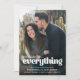 Humoristisk save the date förlovningsannonsering med ett foto av dig och din partner, talesättet 'det här kan förstöra...allt', era namn, datum och platsen för ert kommande bröllop.