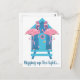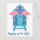 Roligt flamingo julkort vykort med flamingopar som dekorerar sin strandstuga med julgransljus för högtiderna och orden "Rigga upp ljusen". Sött strandigt vykort för att skicka till vänner och familj under julen vid havet.