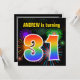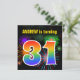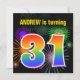 Denna roliga och livfulla design för födelsedagsinbjudan har ett färgrikt mönster inspirerat av fyrverkerier som exploderar i en festlig explosion, tillsammans med siffran "31" med ett flerfärgat regnbågsliknande spektrum eller gradientmönster. Namnet på framsidan kan anpassas. Baksidan visar personlig information om festen. Födelsedagsinbjudningar som denna kan skickas för att inbjuda gäster till en födelsedagsfest som hålls för att fira någon som fyller 31 år.