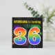 Denna roliga och livfulla design på ett födelsedagsinbjudningskort har ett färgglatt fyrverkeri-inspirerat mönster, tillsammans med siffran "36" som har ett flerfärgat regnbåg-liknande spektrum eller övergångsmönster. Namnet på framsidan kan anpassas. Baksidan har anpassningsbar information om festen. Födelsedagsinbjudningar som denna kan skickas till potentiella gäster för en födelsedagsfest som hålls för att fira någon som fyller trettiosex.