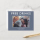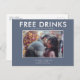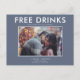 Spara datuminbjudningar som är för det roliga paret som inte kan vänta med att dela sitt bröllopsdatum med sin familj och vänner. Modernt foto "Gratis drycker (och vi gifter oss) design i vinterblått och vitt är anpassat med ditt foto, namn, bröllopsdatum och plats. Lägg till din returadress och bröllopsdetaljer på baksidan av vykortet.