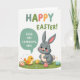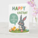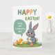Det här kortet visar en vårscen där en grå kanin med extra långa öron och rosiga kinder lutar sig nära en liten gul kyckling, deras ansikten vända mot varandra med en otvungen, vänlig närhet 🐰. Kaninens gapande grin och stora mörka ögon får den att se ut som om den är mitt i ett skämt, medan kycklingen står i närheten som om den lyssnade på. Längs den nedre delen sitter flera dekorerade ägg i korall, senap och turkos på en rik grön gräsplätt, vilket antyder en avslappnad liten jakt. Små blommor och bladformer strös omkring i förgrunden och lägger till mild säsongsdetalj 🌷. Nära kaninen rymmer en rund pratbubbla frasen “ÄGG ÄR DYRA, BRO!” i vit text. Längs toppen syns “GLAD PÅSK!” i stora rundade bokstäver med mjuka nyanser i grönt, orange och turkos. Illustration