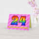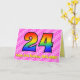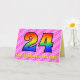 Denna roliga och festliga födelsedags gratulationskort för 24-årsdagen har en framsida med en stor siffra "24" med ett färgrikt regnbågsspektrum-inspirerat övergångsmönster, på en rolig bakgrund med randigt mönster i ljusrosa och mörkrosa hjärtformer. Framsidan har också texten "Happy 24th Birthday," och en personlig mottagares namn. Insidan har ett personligt födelsedagsgratulationsmeddelande, eller kanske kan det rensas och lämnas tomt om ett meddelande ska skrivas för hand istället. Ett personligt födelsedagskort som detta kan vara ett roligt och lyckligt sätt att skicka födelsedagsönskningar till någon som firar sin tjugofjärde födelsedag.