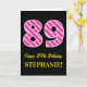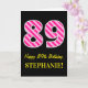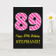 Bekläda av denna roligt och enkla födelsedag-themed hälsningkortdesign presenterar en stort antal "89" med ett ljust - det rosa och mörka rosa randmönster, tillsammans med meddelandet "den 89th födelsedagen för lycklig," och ett personlignamn. Bakgrunden av bekläda är färgadsvarten. Insidan presenterar ett meddelande för anpassadefödelsedaghälsning eller kunde kanske göras klar, och tom vänstersida, om ett meddelande är att vara skriftligt by, räcker i stället. En något liknande för personligfödelsedagkort denna styrka är en roligt långt som överför födelsedagönskemål till någon som firar deras nionde födelsedag för åttio. [~Z0000377]