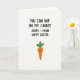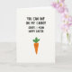Det här kortet har en ljus vit bakgrund med en fler-radig skämtsam hälsning placerad överst i ett tjockt, ledigt sans-serif-tecken med mörk text för stark kontrast. Den första raden läses som en flörtig upptakt, men förvandlas snabbt till en säsongsbunden påskhälsning, vilket ger layouten en vänlig blinkning. Under texten sitter en enda tecknad rotfruktskaraktär, centrerad och något större än texten ovan, som om den lyssnade på skämtet 🐰. Grönsaken är en varm orange konform med tre enkla gröna blad på toppen, och dess lilla ansikte består av två svarta prick-ögon och en krökt mun. Mjuk rosa rodnad på kinderna ger ett blygt, tillgiven utseende, som om den delar ett privat skratt med läsaren 🌷. Det vida öppna vita utrymmet runt omkring håller allt luftigt, med det orange och gröna som tydligt sticker ut mot bakgrunden. Meddelandet stannar överst