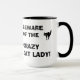 En humoristisk mugg som lite petar en roligt på kattälskare. Denna svartvita themed ringermugg presenterar en skrämd katt, och texten "akta sig av den galna kattdamen" på högersidan. Vänstersidan presenterar ord "som varnar!".