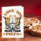 Dela med en nypa humor och kärlek denna Alla hjärtans dag med vårt Jag älskar dig mer än pizza Alla hjärtans dag-kort! Med en rolig serieillustration av två pizzapersoner som njuter av en middag i ljuset av levande ljus (med mer pizza!), är detta kort perfekt för pizzälskare med en humoristisk ådra. Den söta och roliga designen kombinerar kärlek och skratt med en udda pizzatemad twist. Känslan på insidan lyder: "Du är den enda som kan stjäla en bit av mitt hjärta! (Men rör inte min pizza.)" Oavsett om det är till din partner, bästa vän eller en annan pizza-enthusiast, är detta kort ett härligt sätt att säga "Jag älskar dig!" Redigera text från produktsidan eller ändra teckensnittsstil