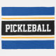 Den här sportetiska, atletiska designen har fet PICKLEBALL-text inuti ett markerat vitt svart rand med dubbla vit och gult tävla ränder mot djupt blå yttre ränder. Texten i den här designen kan vara personlig.